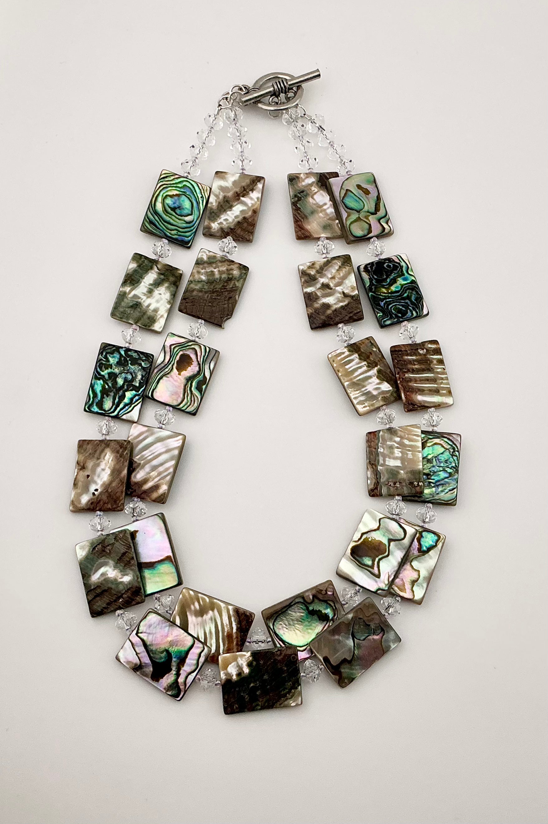 A double strand abalone shell necklace with crystal beads handcrafted by Native American artisan Kathy Martinez of the Pit River tribes of Northern California. Approximately 16 inches in length.